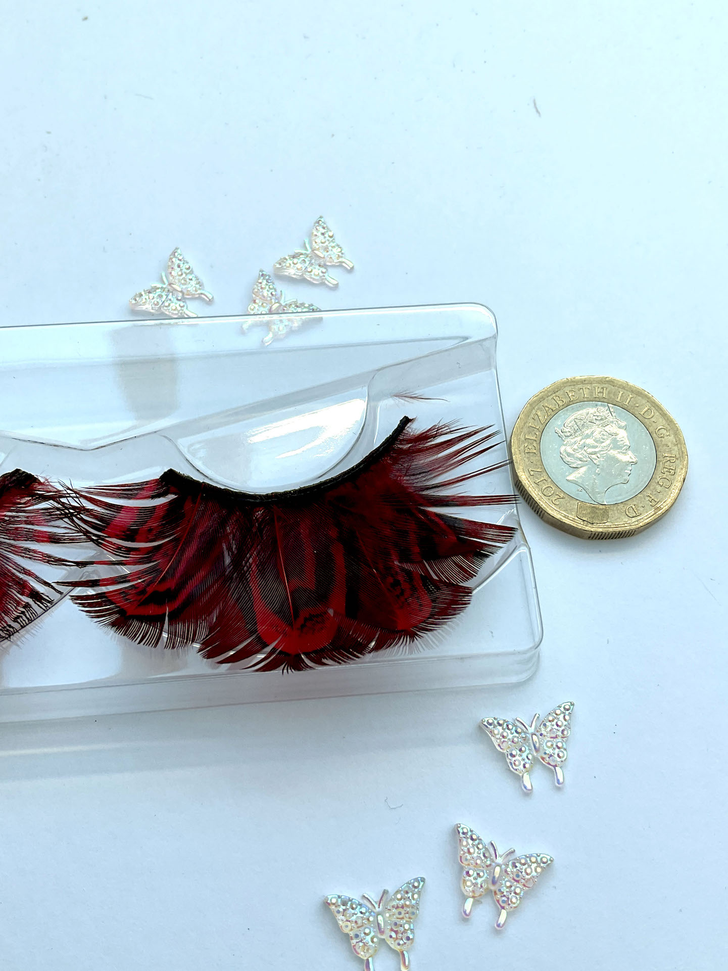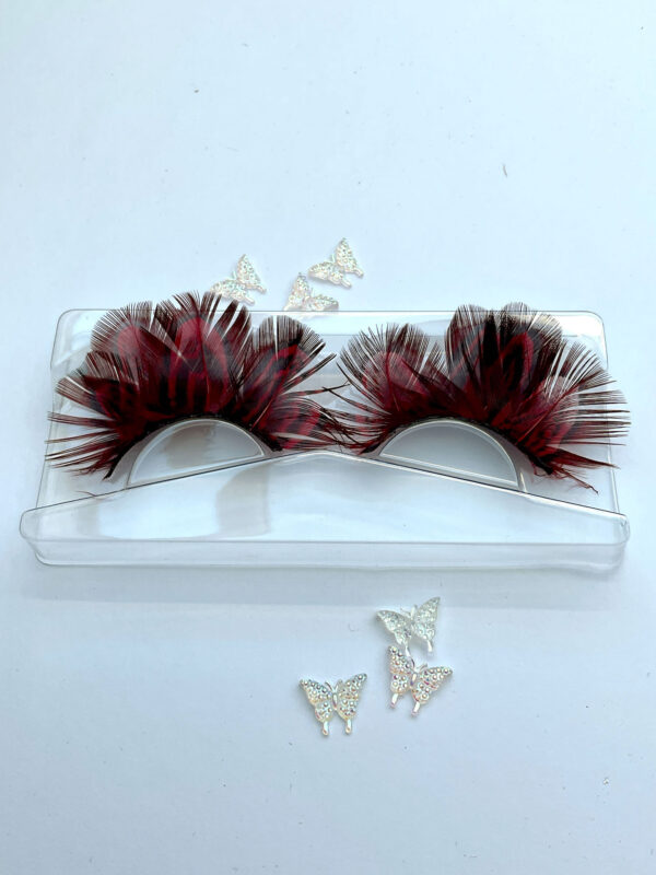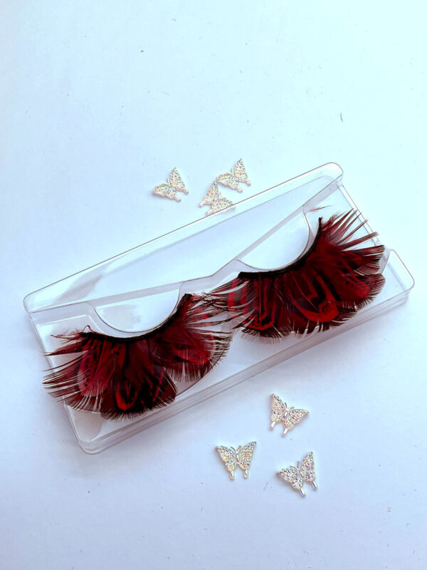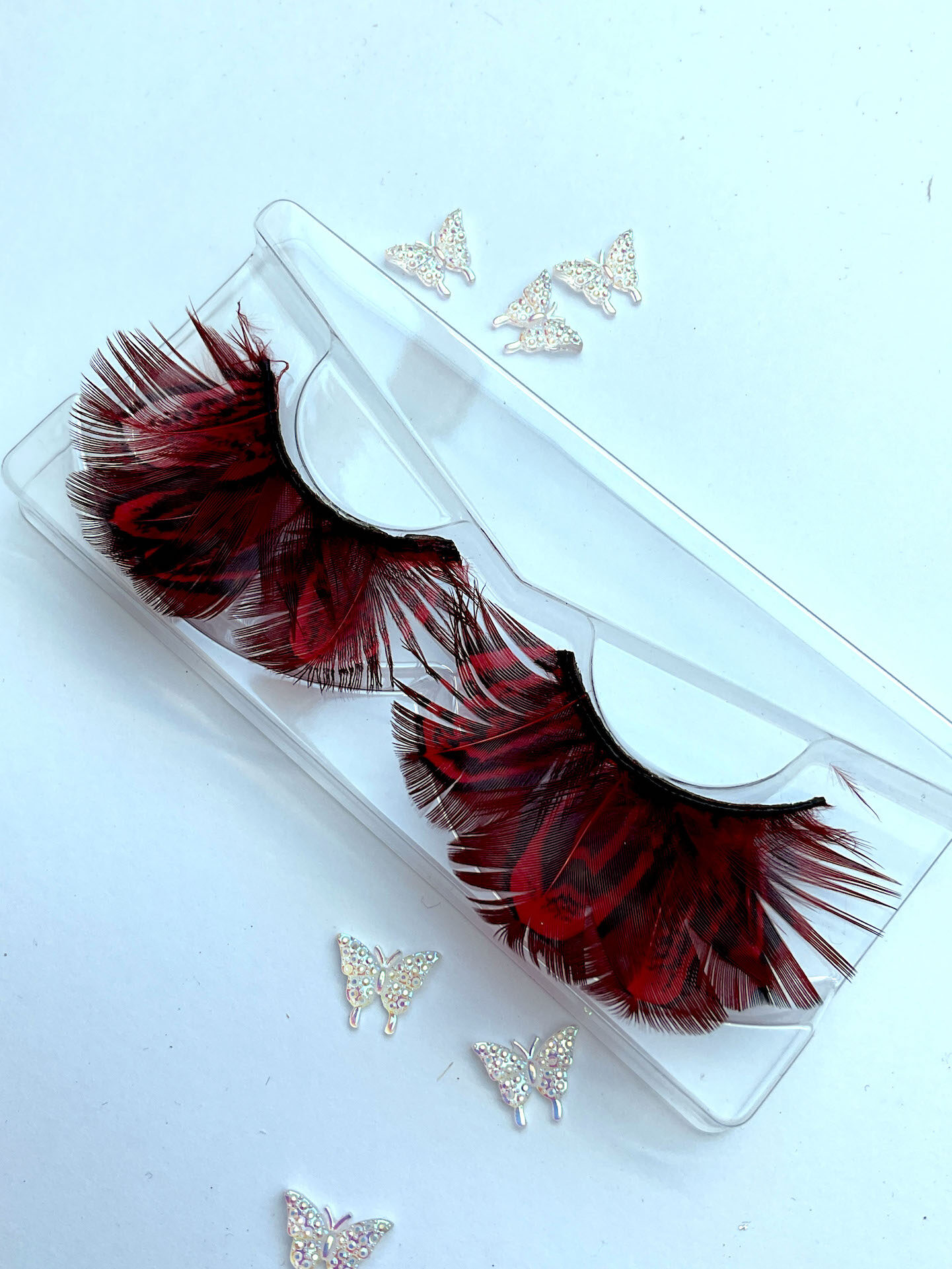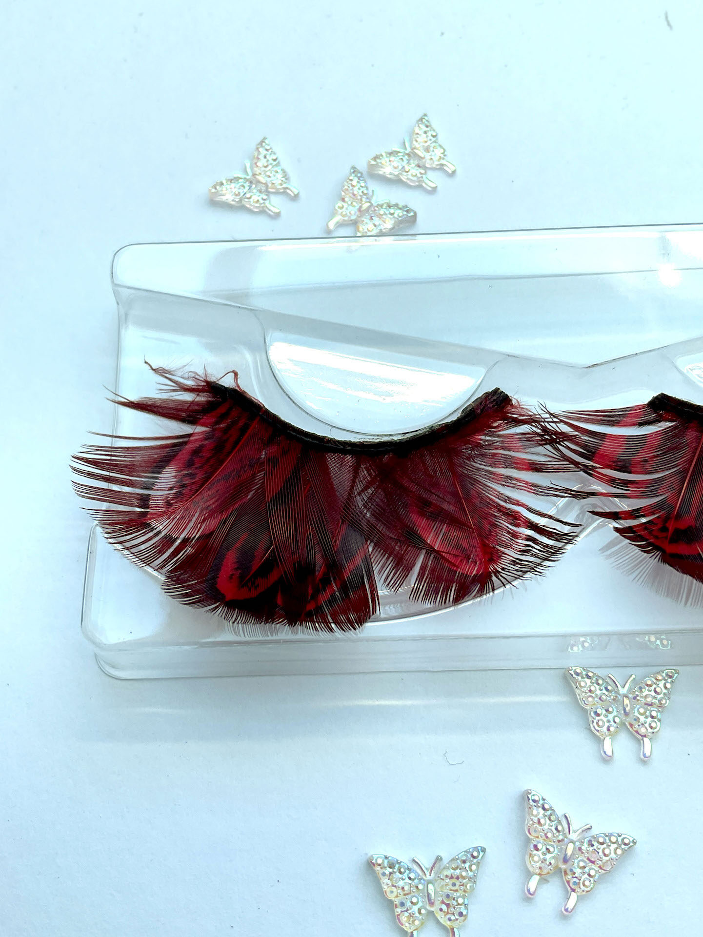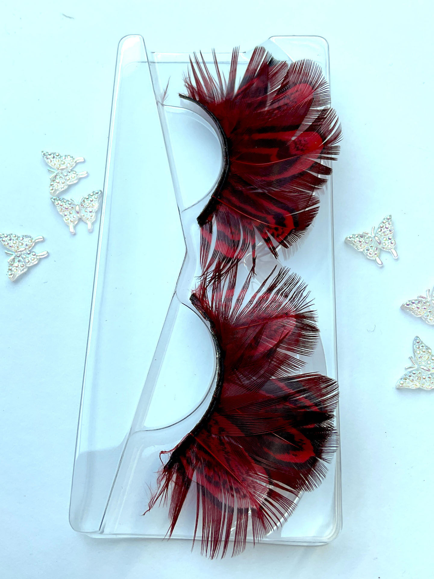This is Spicy. She is one pair of fabulous feather false eyelashes in black and red. Each lash set is different.