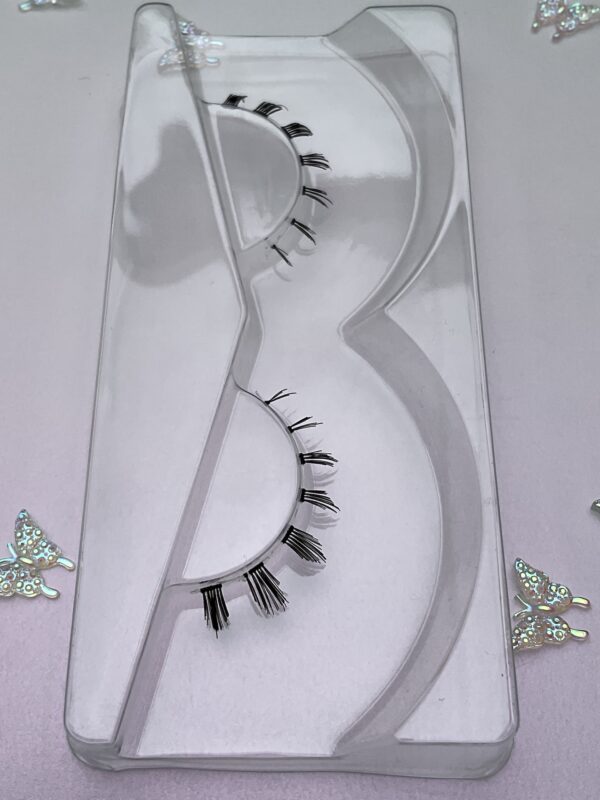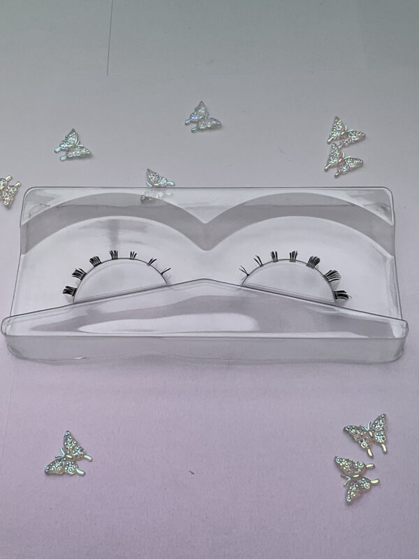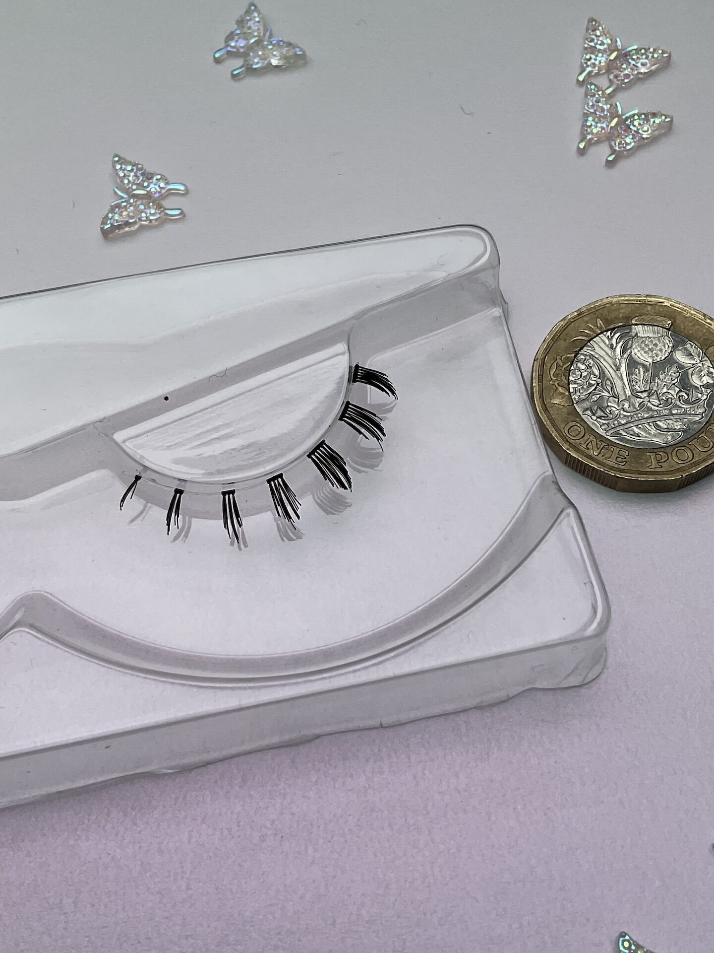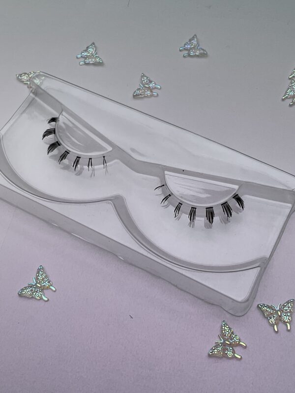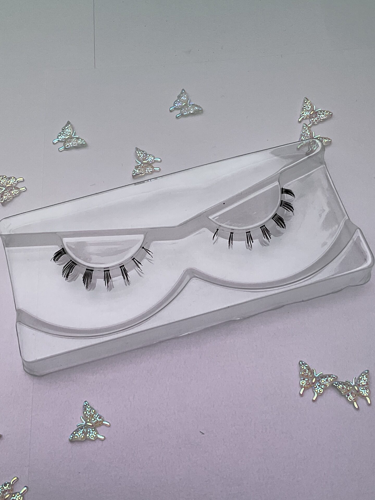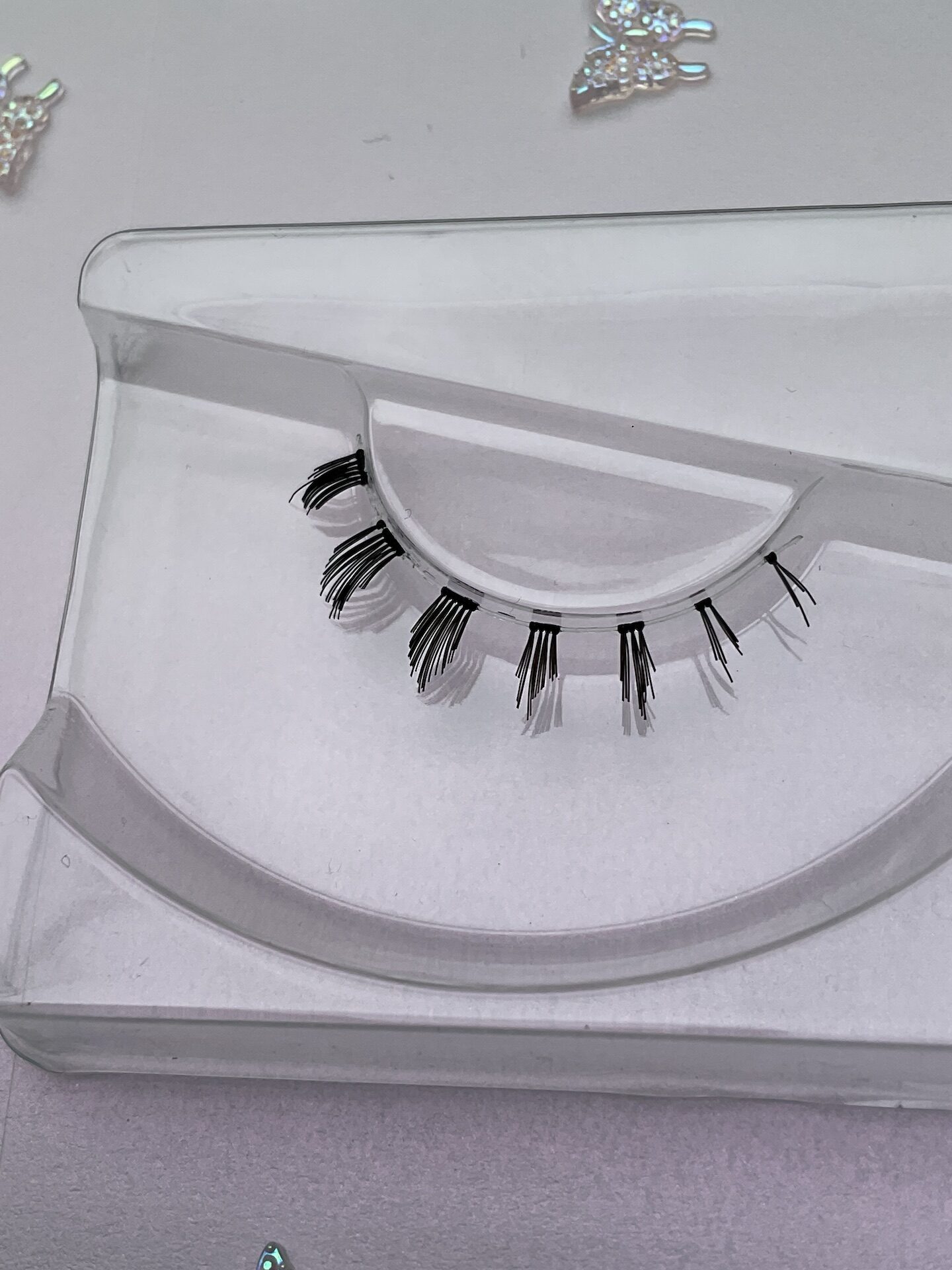 This is Tessa, a super cute tiny lower lash in black. She is a cute spiky set of lashes in alternating stripes on a transparent lash band.
