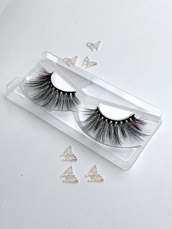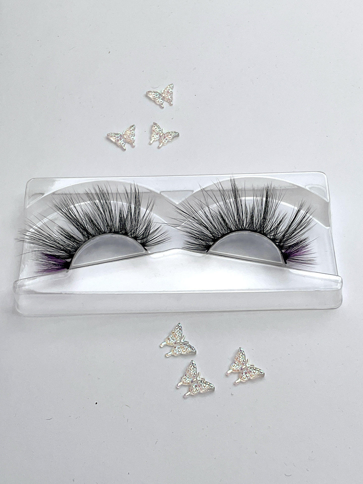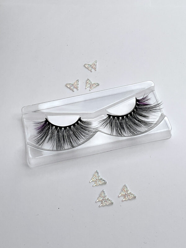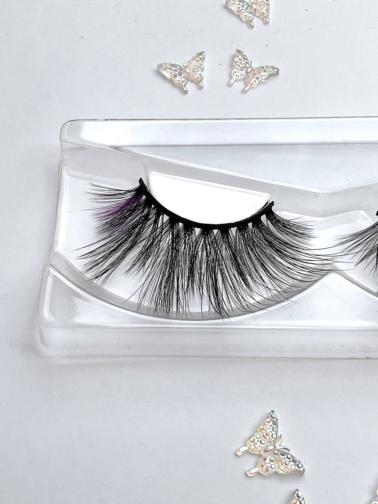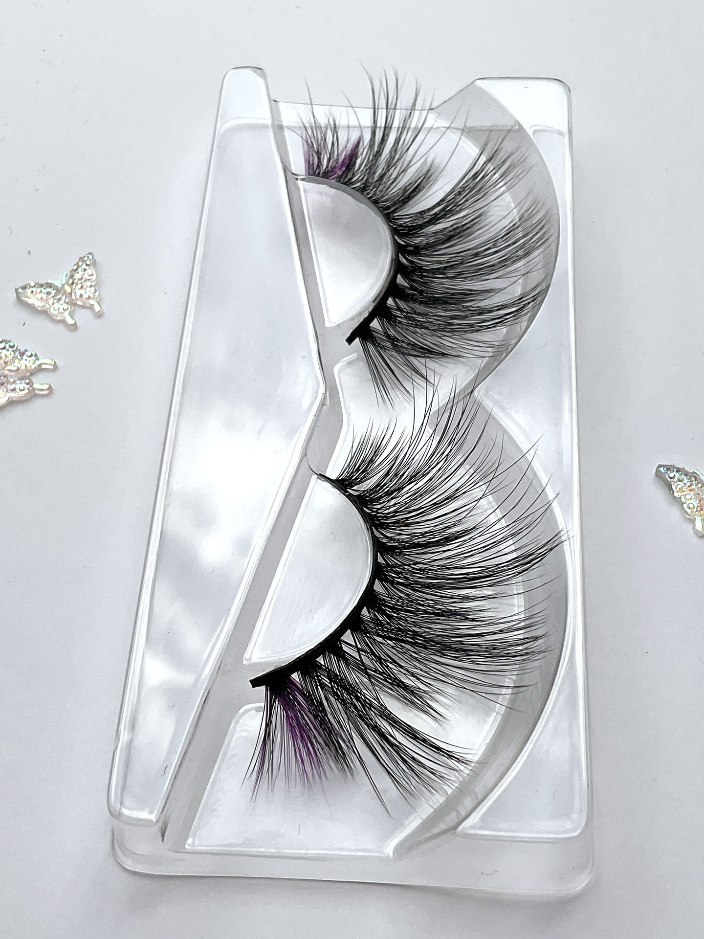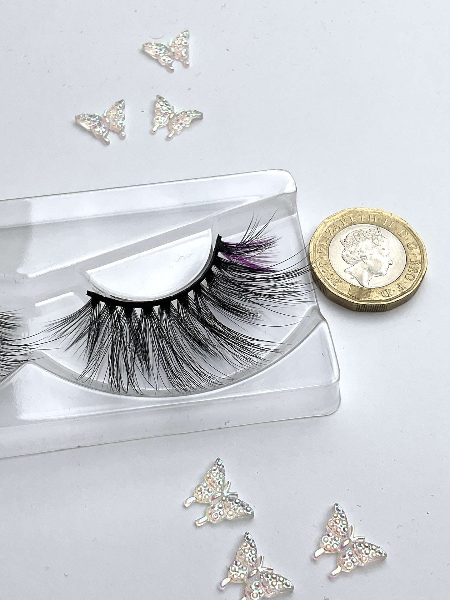 This is Tia. She is one pair of fabulous long, delicate and wispy 15-20mm false eyelashes, in black with a purple wing, the lash hairs positioned in a V-formation.