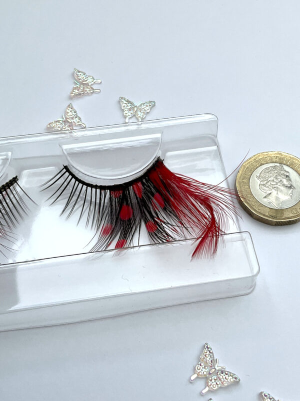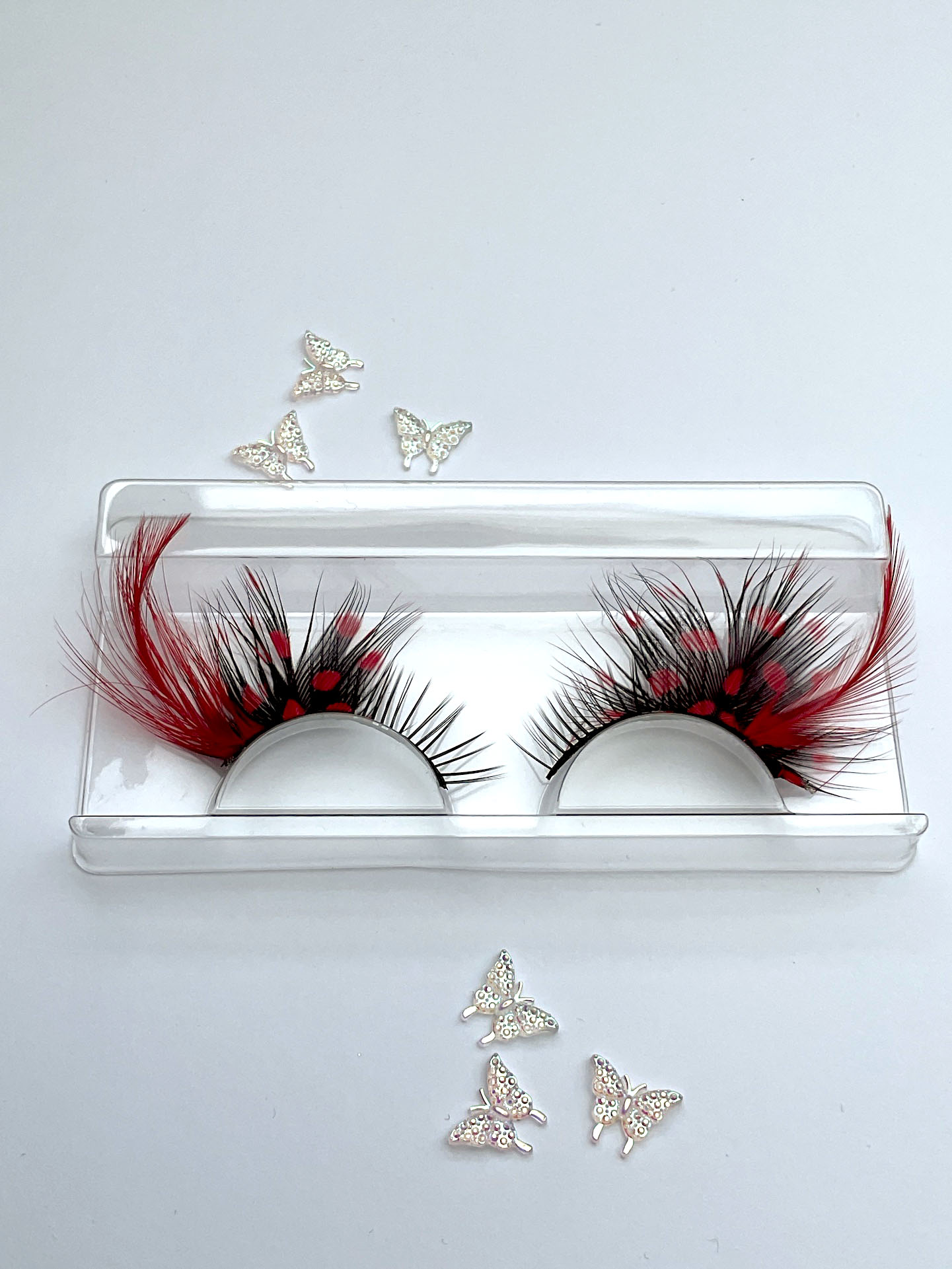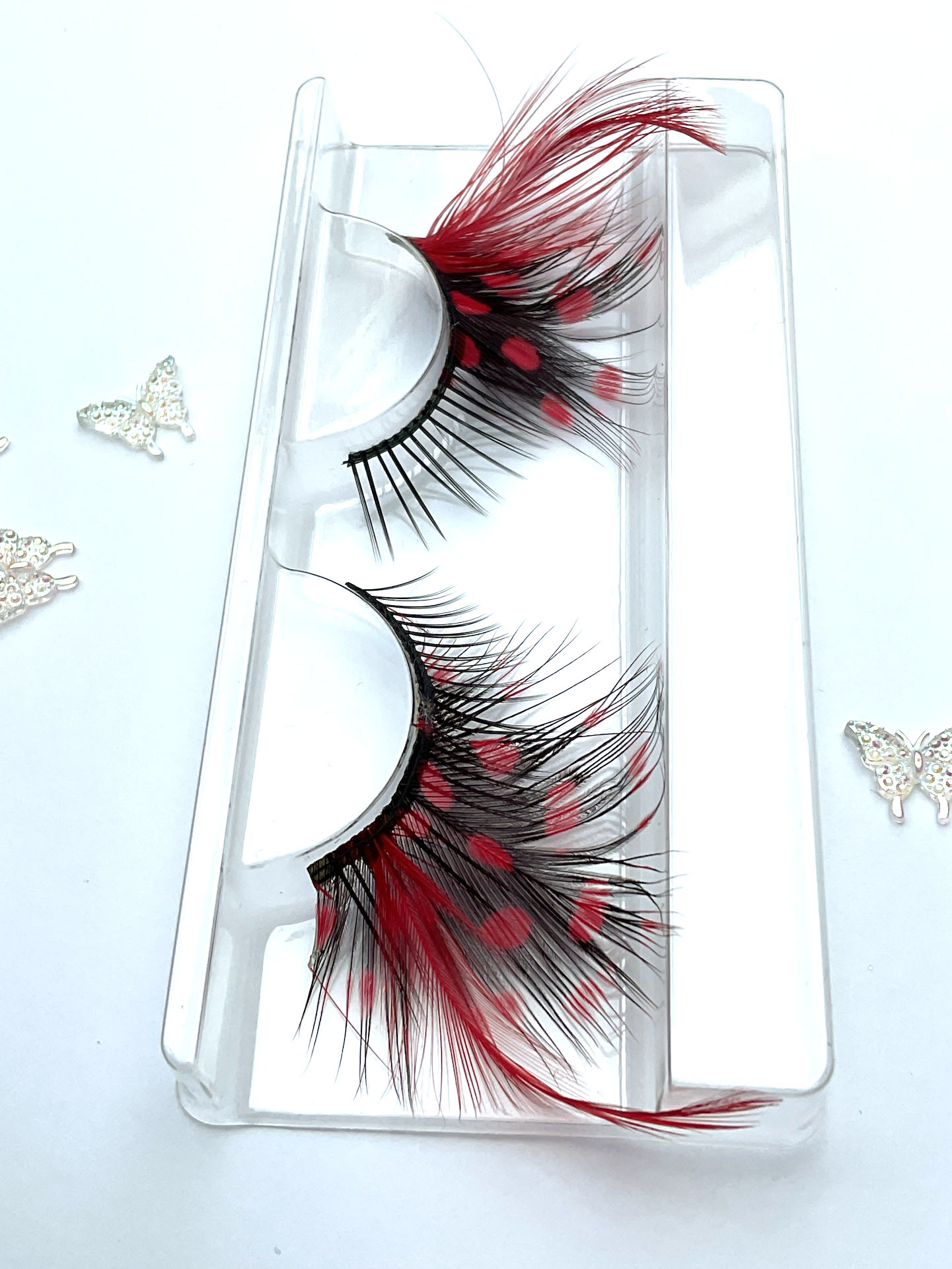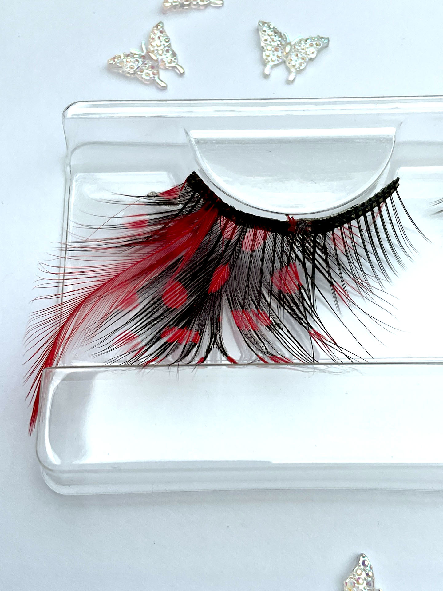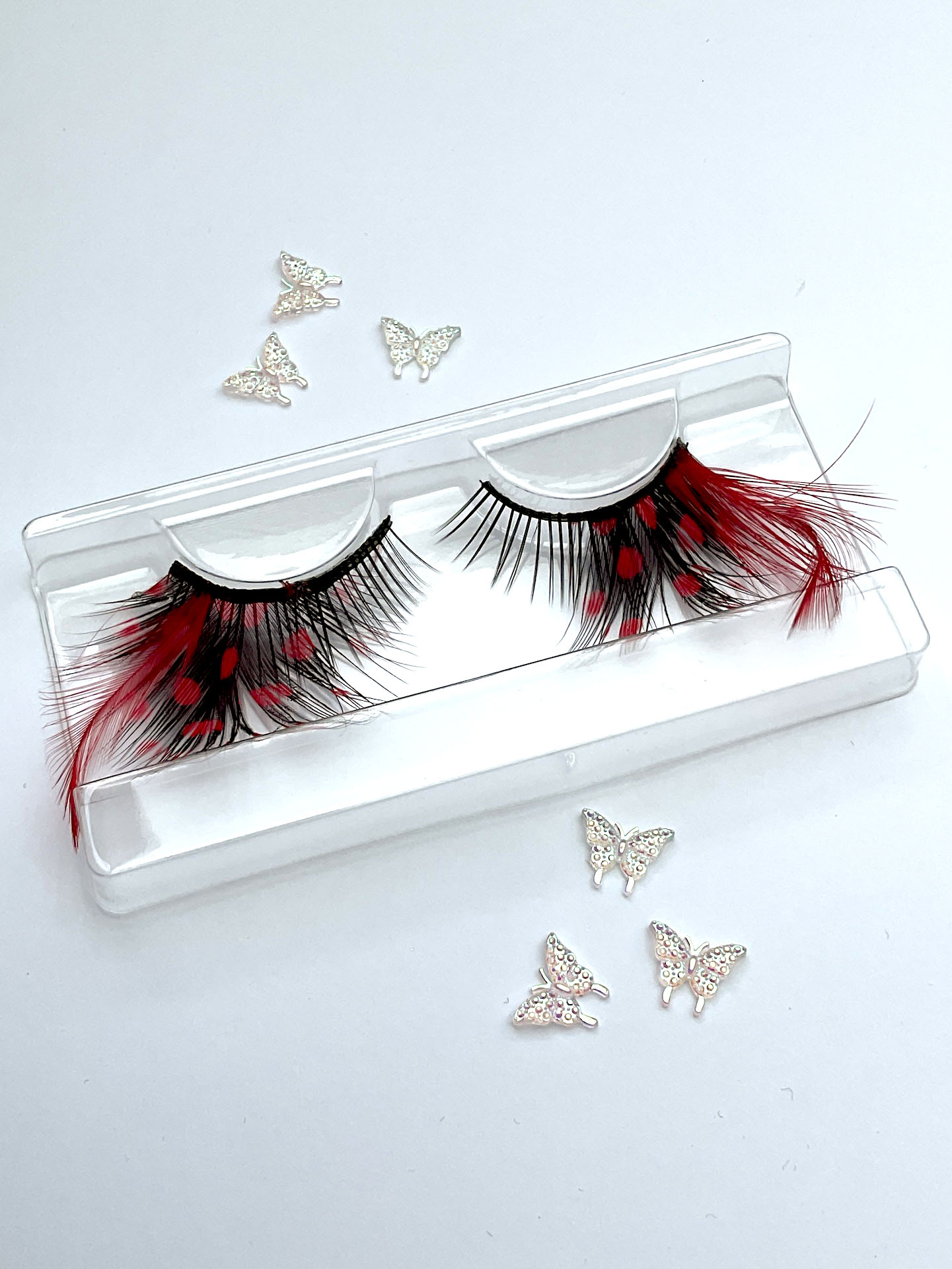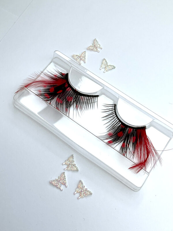 This is Valentine. She is one pair of fabulous winged feather false eyelashes in black with a polkadot wing in black and red. Each lash set is different.