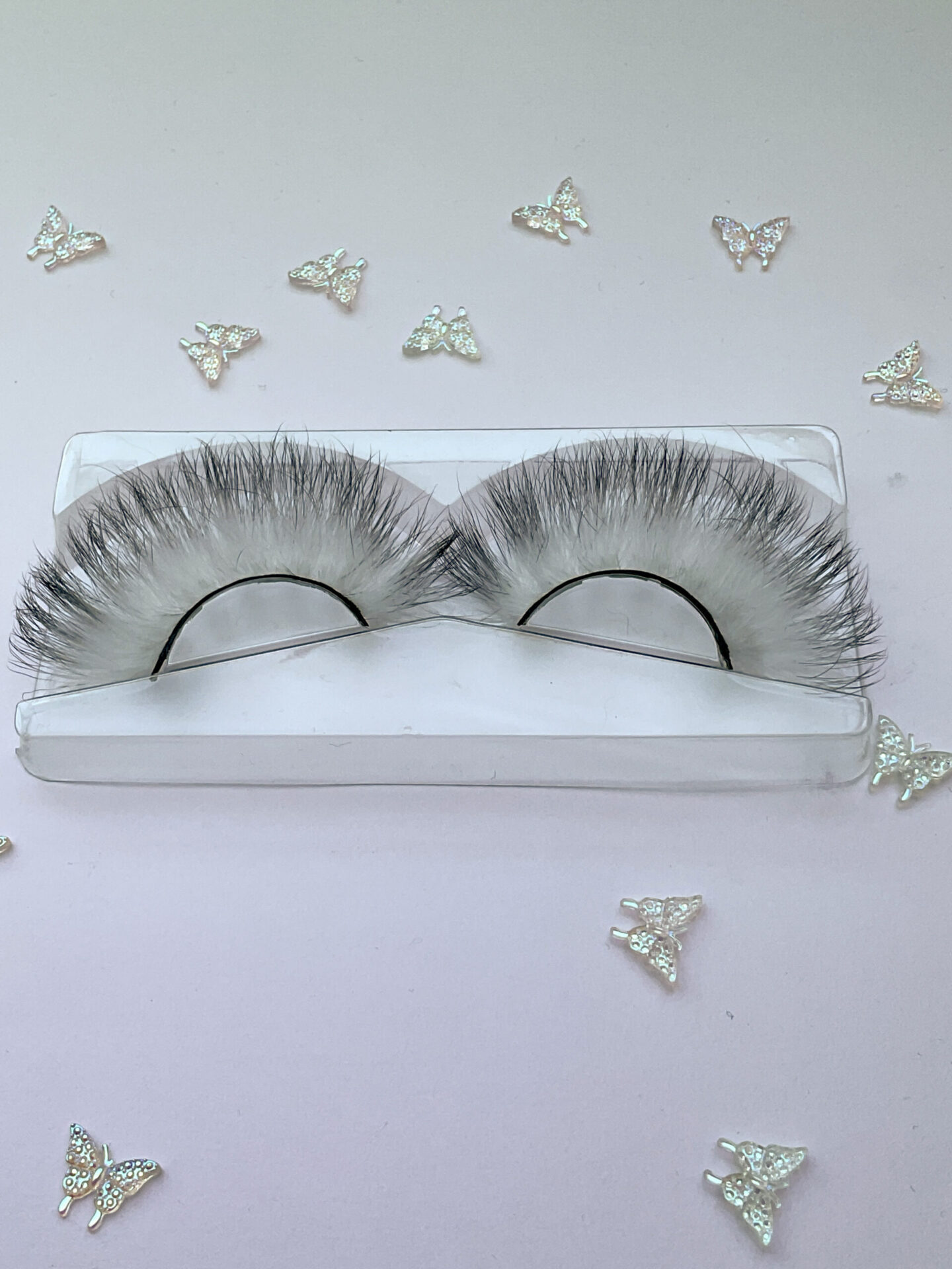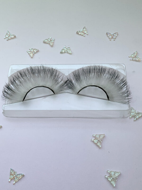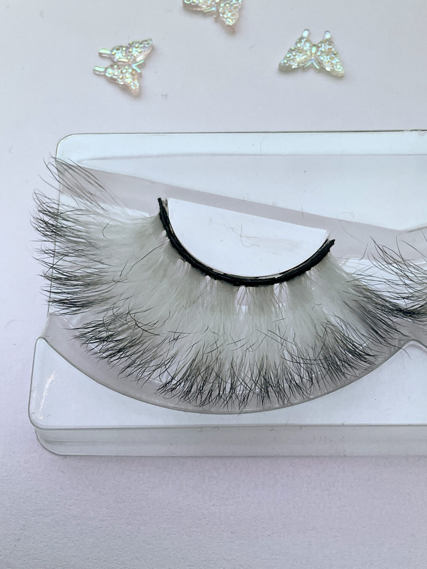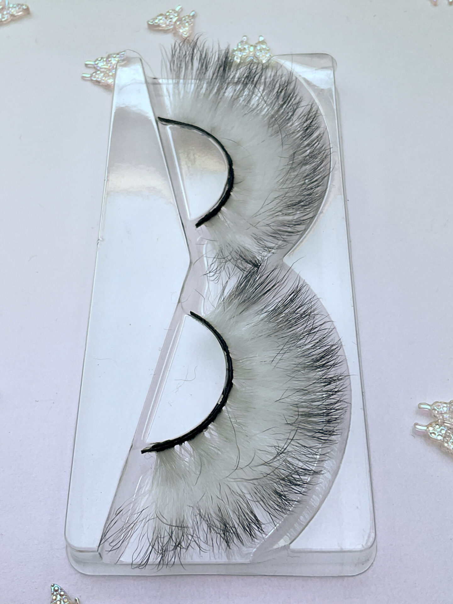 This is Winterrose. She is a longer and fuller set of ombré lashes, pure white into black tips, a great contrast lash, fab worn with blonde hair.