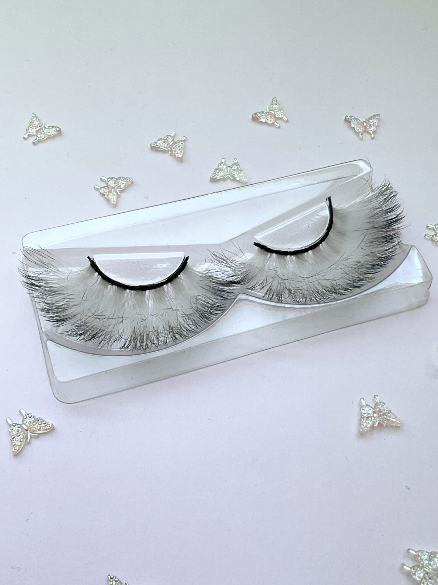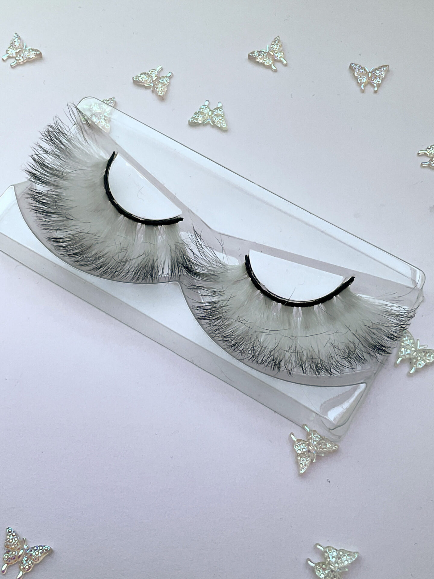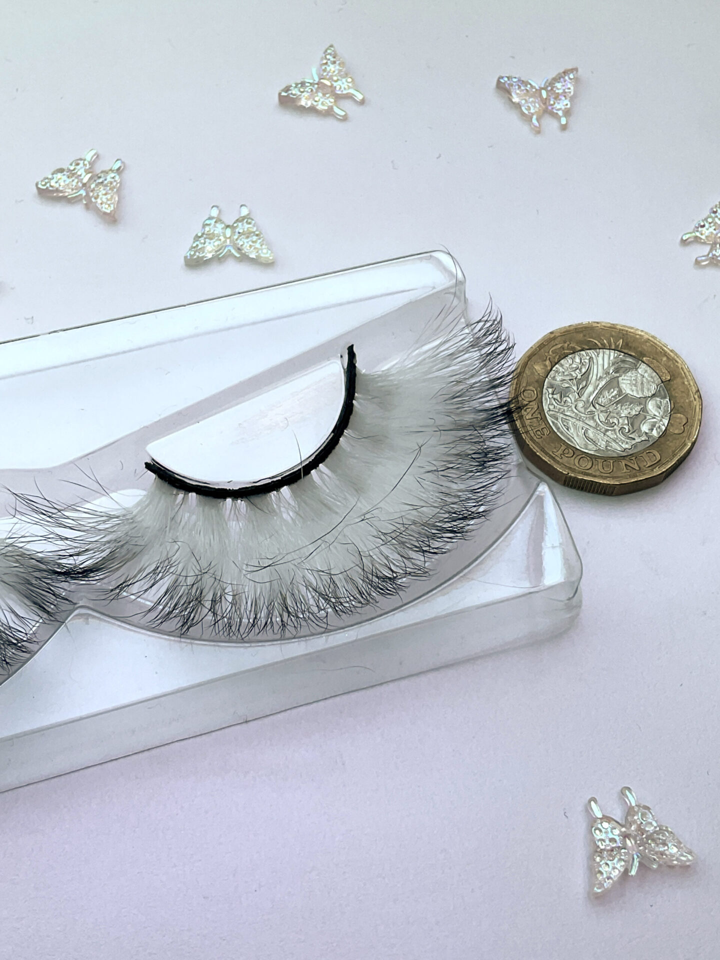 This is Winterrose. She is a longer and fuller set of ombré lashes, pure white into black tips, a great contrast lash, fab worn with blonde hair.