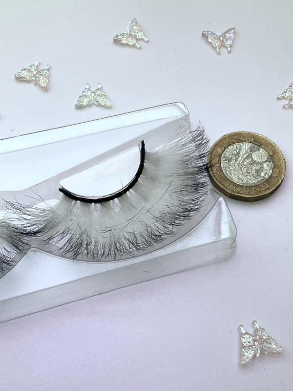 These are one pair of 20-25mm false eyelashes. Synthetic hair, hand tied on a clear lash band.